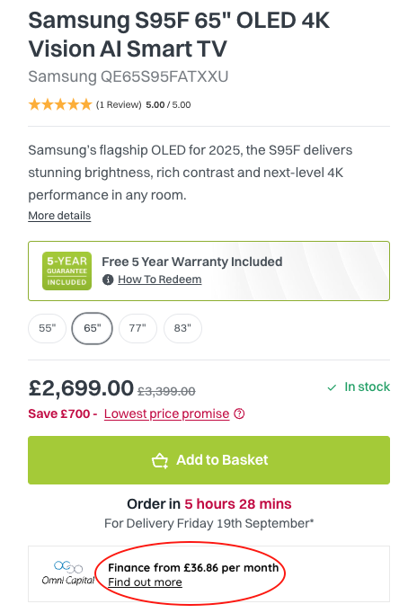 👉 Example: On a £2,699 order with a £269.90 deposit, you could spread the balance of £2,429.10 over: