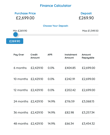 Choose your deposit: as little as 10% of the order value (e.g. on a £2,699 order, the minimum deposit would be £269.90).